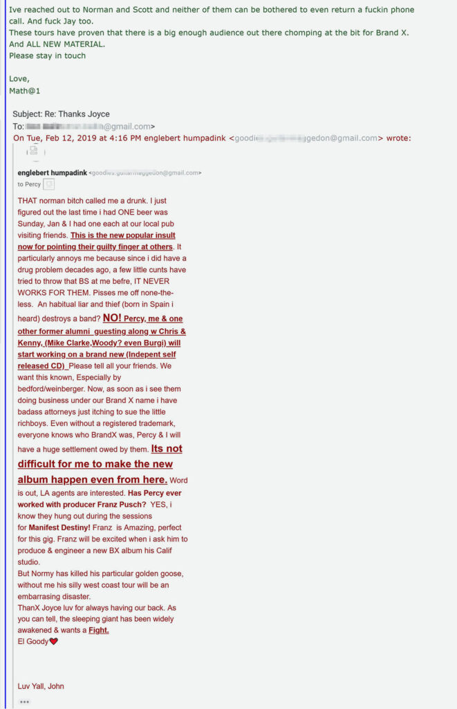 Percy and Robin are gobsmacked, befuddled, and all at sea with these perplexing claims because the John they knew was sending different signals… Can John Goodsall’s emails shed a light on his views of the short-lived Brand X management episode, leading up to his untimely demise in 2021? Needless to say, as lifelong friends, John and Percy were always on the same page, about all that Jazz, and anything else for that matter.